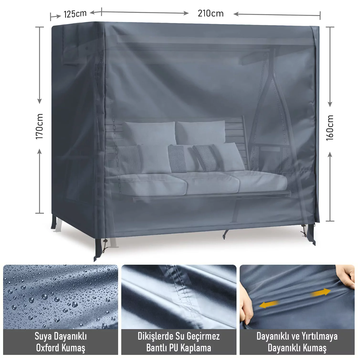 ✅ BAHÇE SALINCAK ÖRTÜSÜ ÖLÇÜSÜ: Bu bahçe salıncak koruma örtüsü boyutu 210x125x (170-160cm) Su birikmesini önlemek için ön tarafın yüksekliği arkadan 10 cm daha yüksek olacak şekilde tasarlanmıştır. 3 kişilik bahçe veranda salıncak sandalyesi için uygundur. En iyi uyumu sağlamak için lütfen satın almadan önce salıncağınızı ölçün. Paket İçeriği: 1x Bahçe Salıncağı Kılıfı, 1x Saklama Çantası.