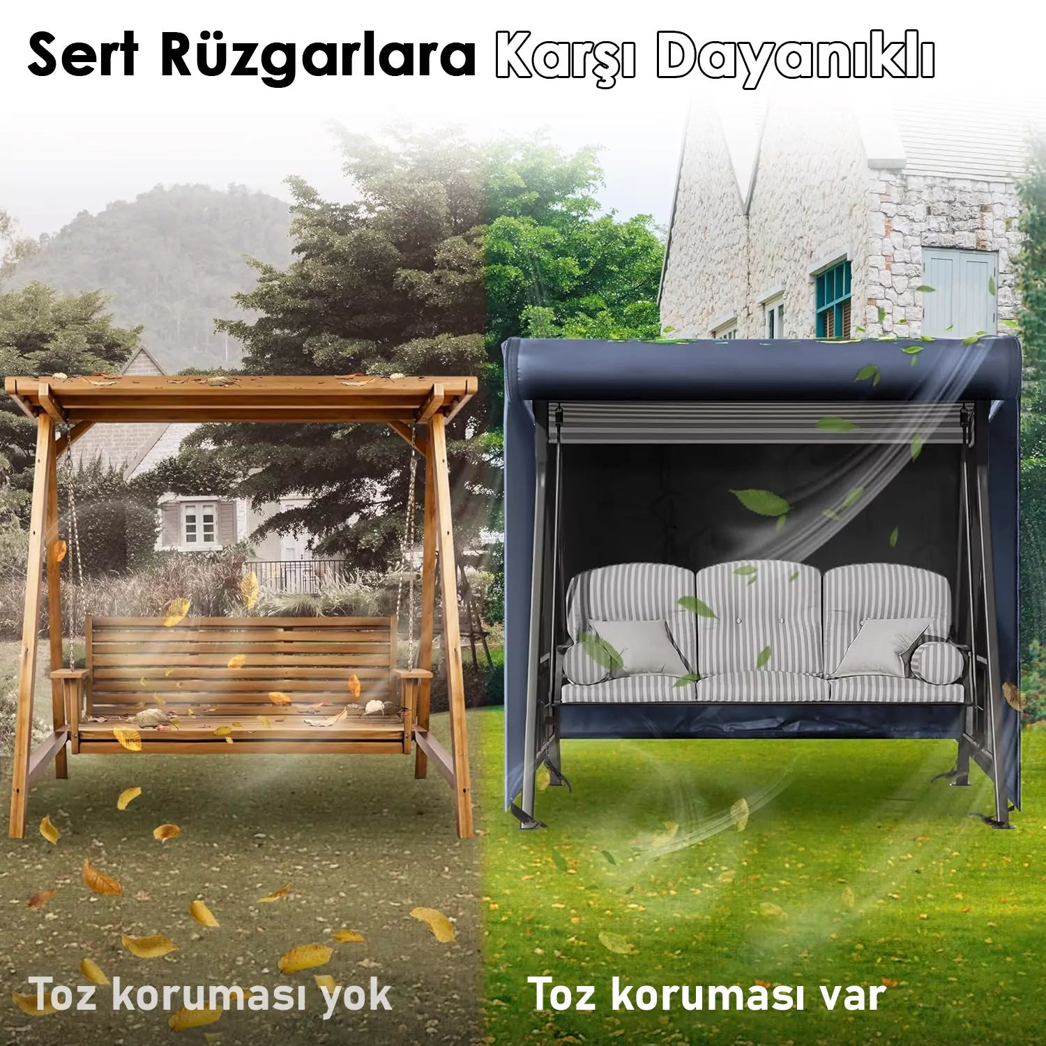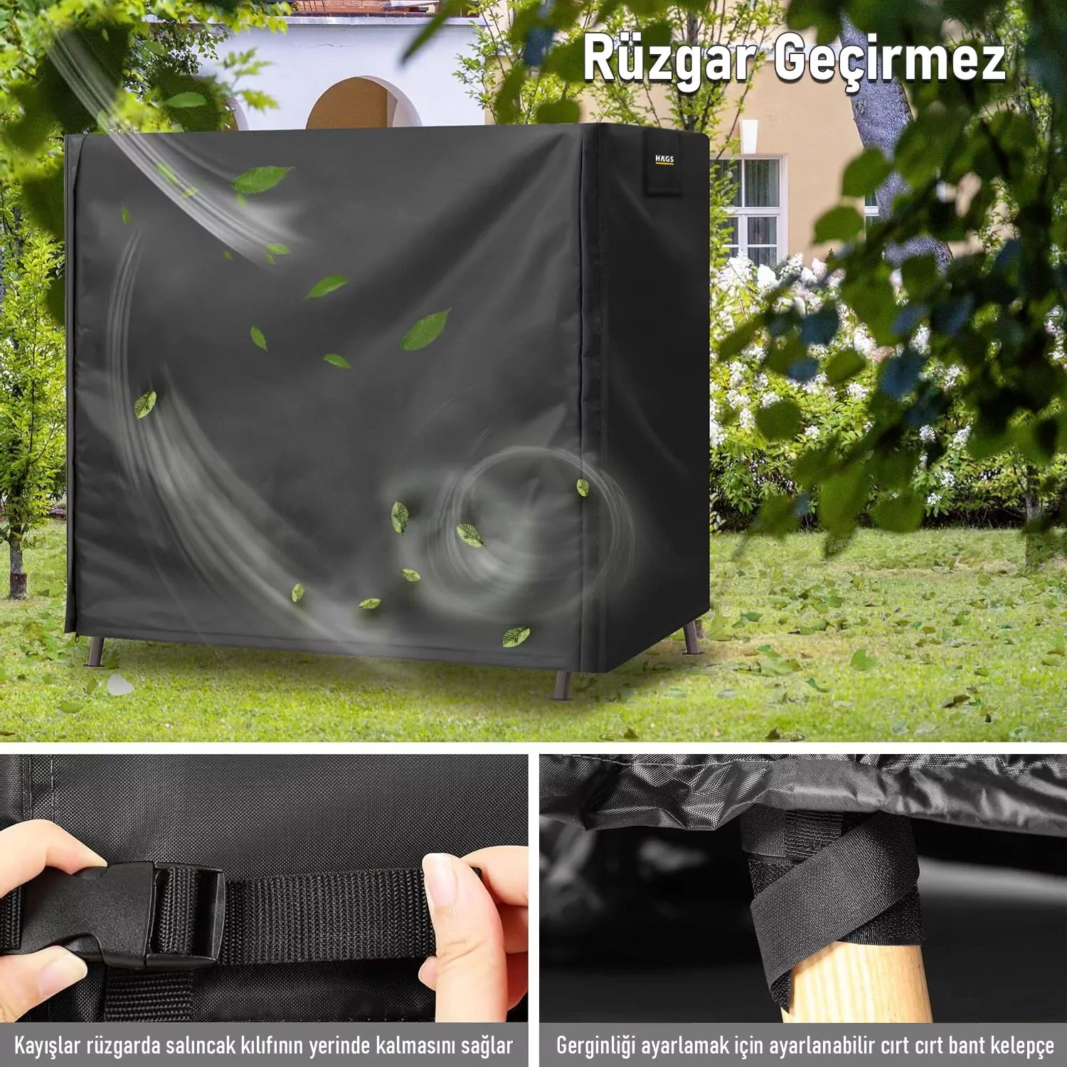 ✅ RÜZGAR GEÇİRMEZ KORUMA: Salıncak kılıfının yerinde kalmasını sağlamak için her köşede 4 adet rüzgar geçirmez cırt bant ile donatılmıştır. Rüzgarlı günlerde daha iyi koruma sağlamak için, kişiye özel uyum için belde 2 adet ayarlanabilir tokalı bağlantı elemanı da tasarladık.