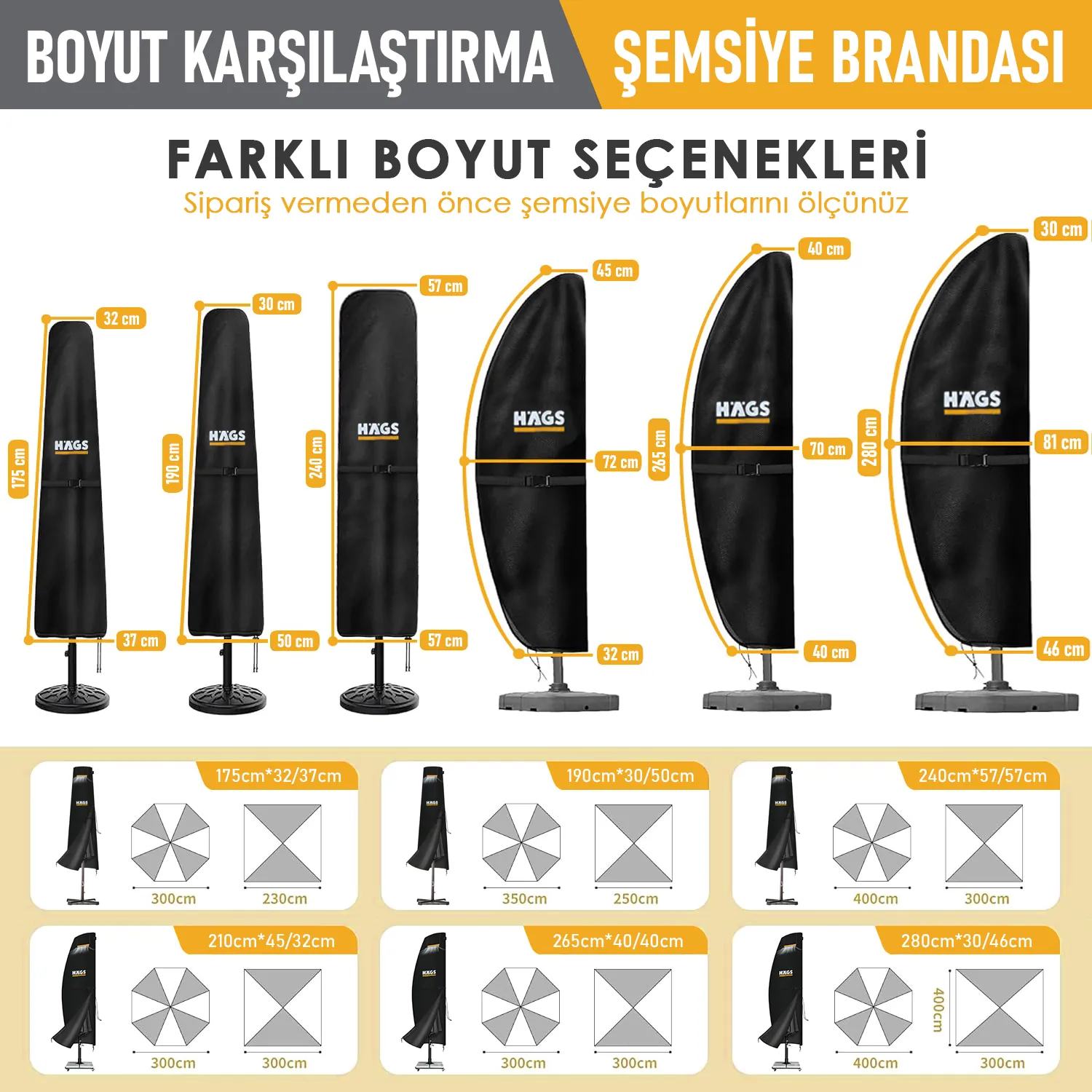 ✅ BAHÇE ŞEMSİYE KORUMA ÖRTÜSÜ ÖLÇÜLERİ: Haegs şemsiye kılıfları yükseklikleri, genişlikleri üst – orta – alt kısım ölçüleri şemsiyenize ideal büyüklük için farklı boyutlarda üretilmektedir, Parasol bahçe veranda dış mekan şemsiyeleri, altıgen, dikdörtgen, üçgen, kare ve yuvarlak şemsiyeler için uygundur. Lütfen satın almadan önce bahçe şemsiyenizin yükseklik ve çapını ölçün.