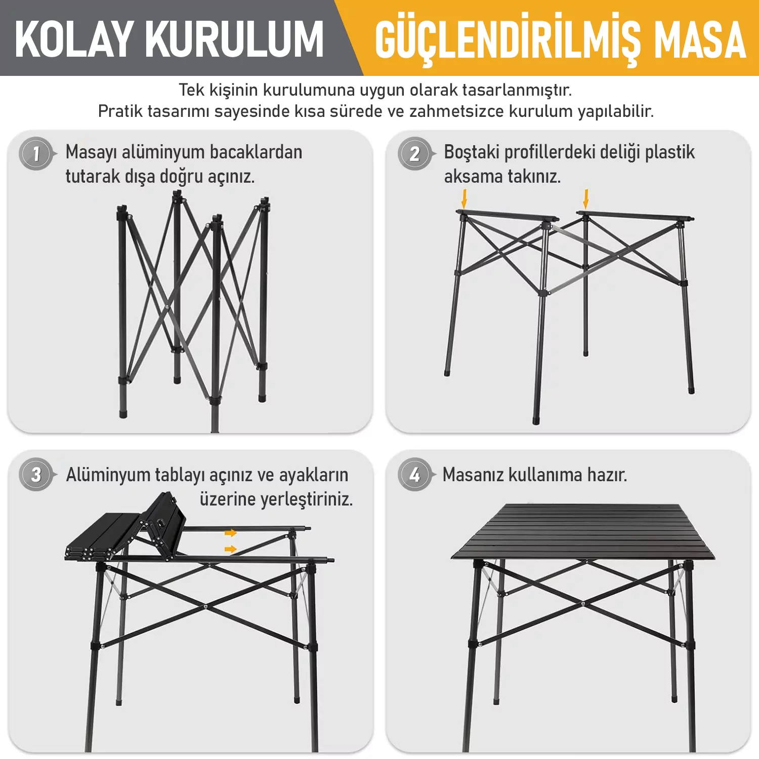 ✅ KOMPAKT GÖVDE YAPISI: Dayanıklı alüminyum masa üstü ve sağlam kalın çerçeve, bu masanın farklı yüzeylerde sabit kalmasını destekler.