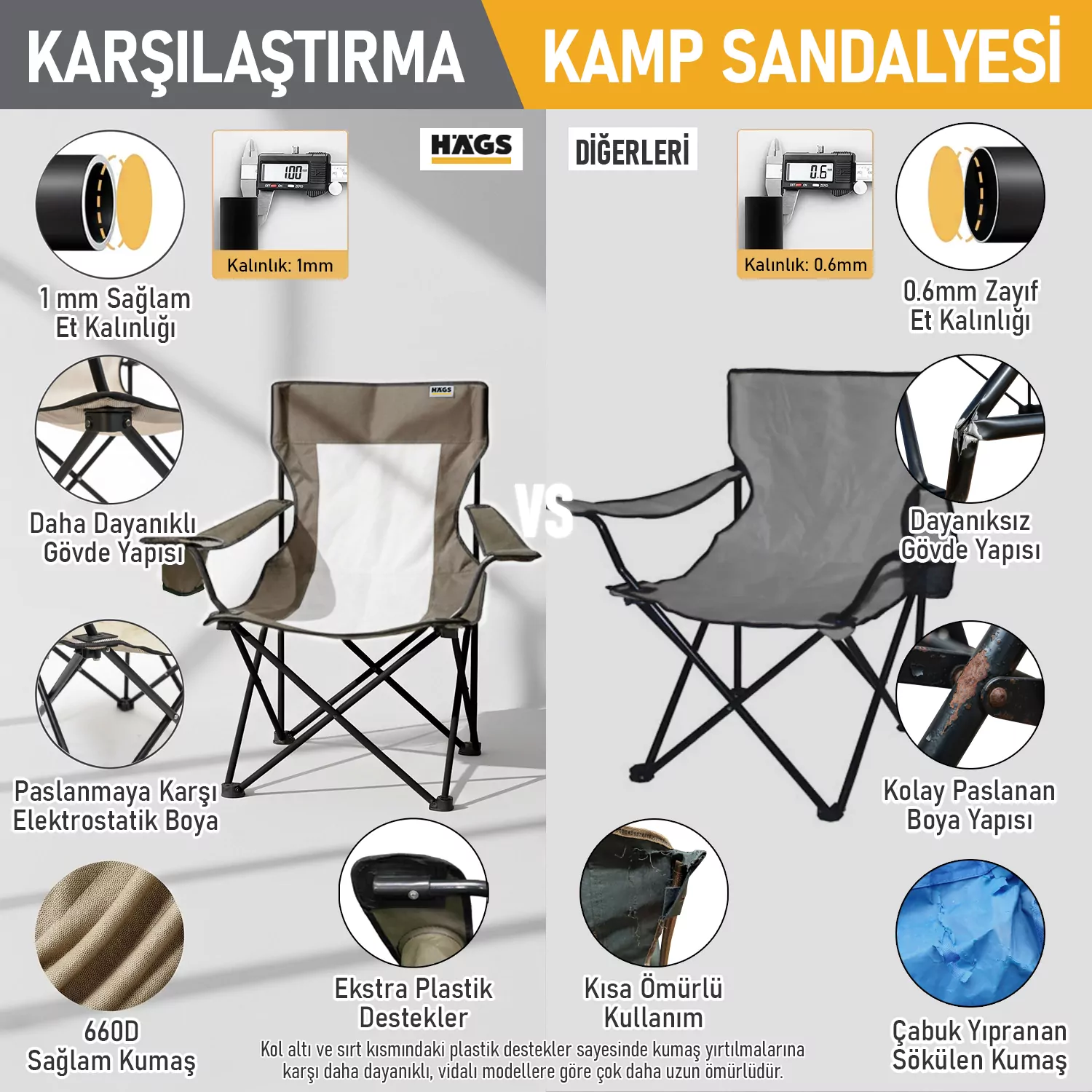 ✅ DAYANIKLI: Haegs kamp sandalyesi, kalın ve sağlam metal borulara, yenilikçi X şeklindeki takviyeye ve dört ağır hizmet tipi metal çerçeveye sahiptir ve 120 Kg’a kadar denge ve yük taşıma kapasitesi sağlar
