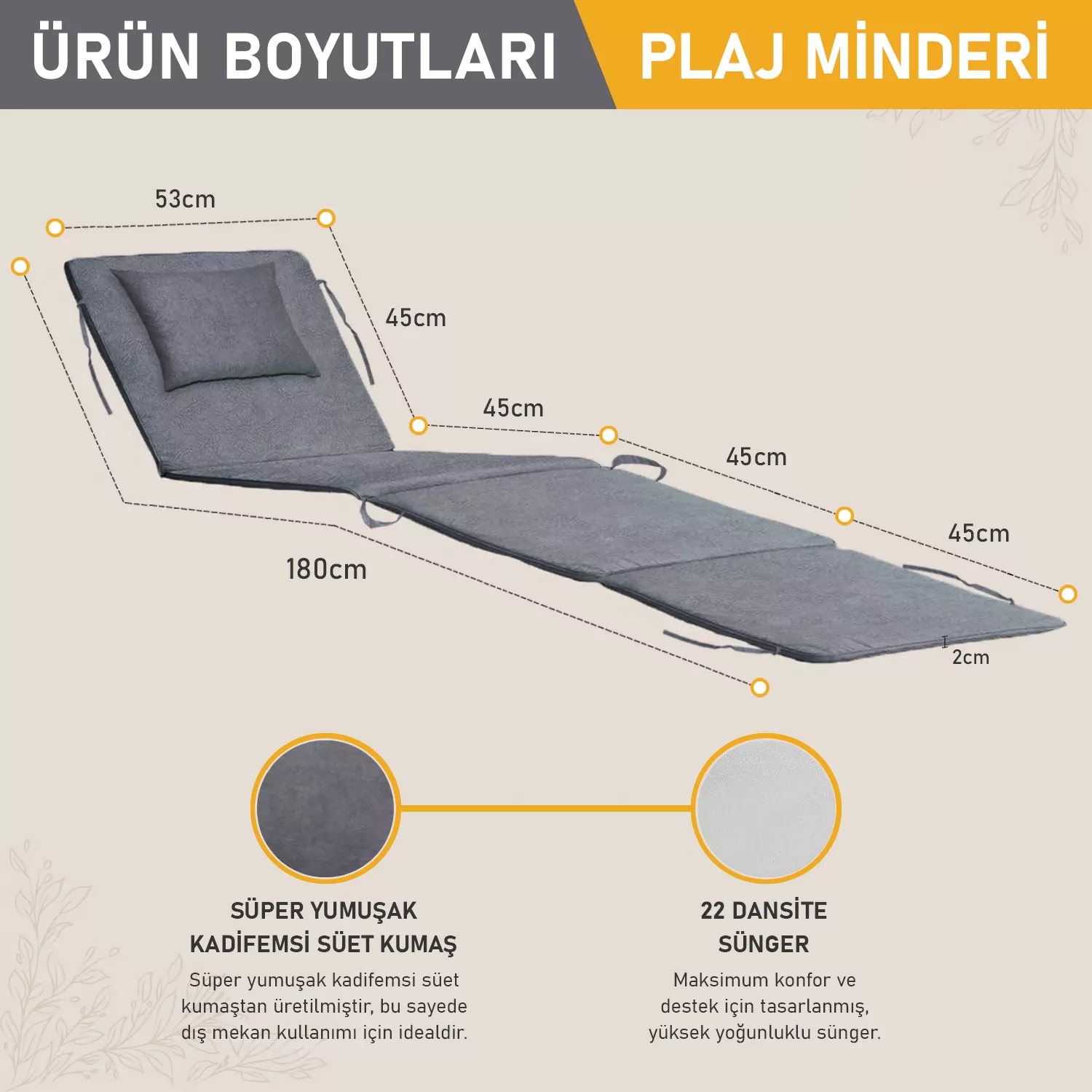 ✅ ESTETİK VE UYGUN BOYUT: 180 x 53 x 2 cm boyutlarındaki bu açık hava plaj çantası minderleri, taşıması kolay, 4’e katlanır uzanmak için ideal boyutlardadır. İster Plajda,ister verandaya, ister güverteye veya havuz kenarı dinlenme alanına sahip olun, bu minderler şık bir şekilde dinlenmenizi ve rahatlamanızı sağlayacaktır.