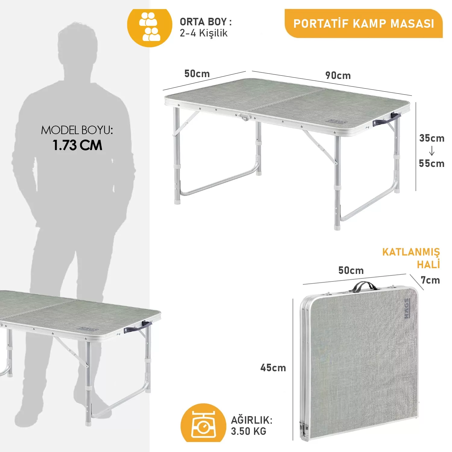 ✅ GENİŞ MASA TABLASI: 90 x 50 cm'lik masa tablası, 3-4 kişinin rahatça yemek yiyebilmesi için bol miktarda alan sunar. Yiyecekler, tatlılar ve içecekler de bu yüksekliği ayarlanabilen kamp masasının üstüne güvenli bir şekilde yerleştirilebilir.