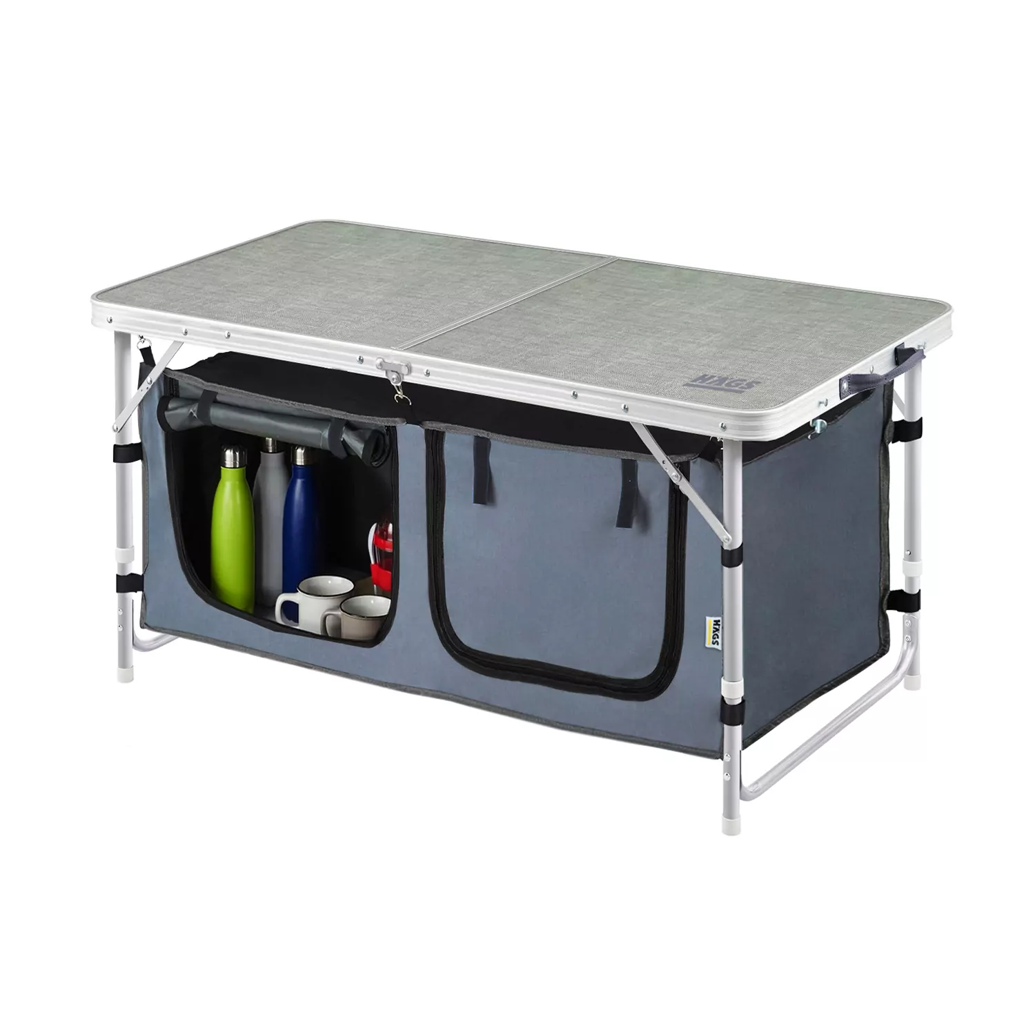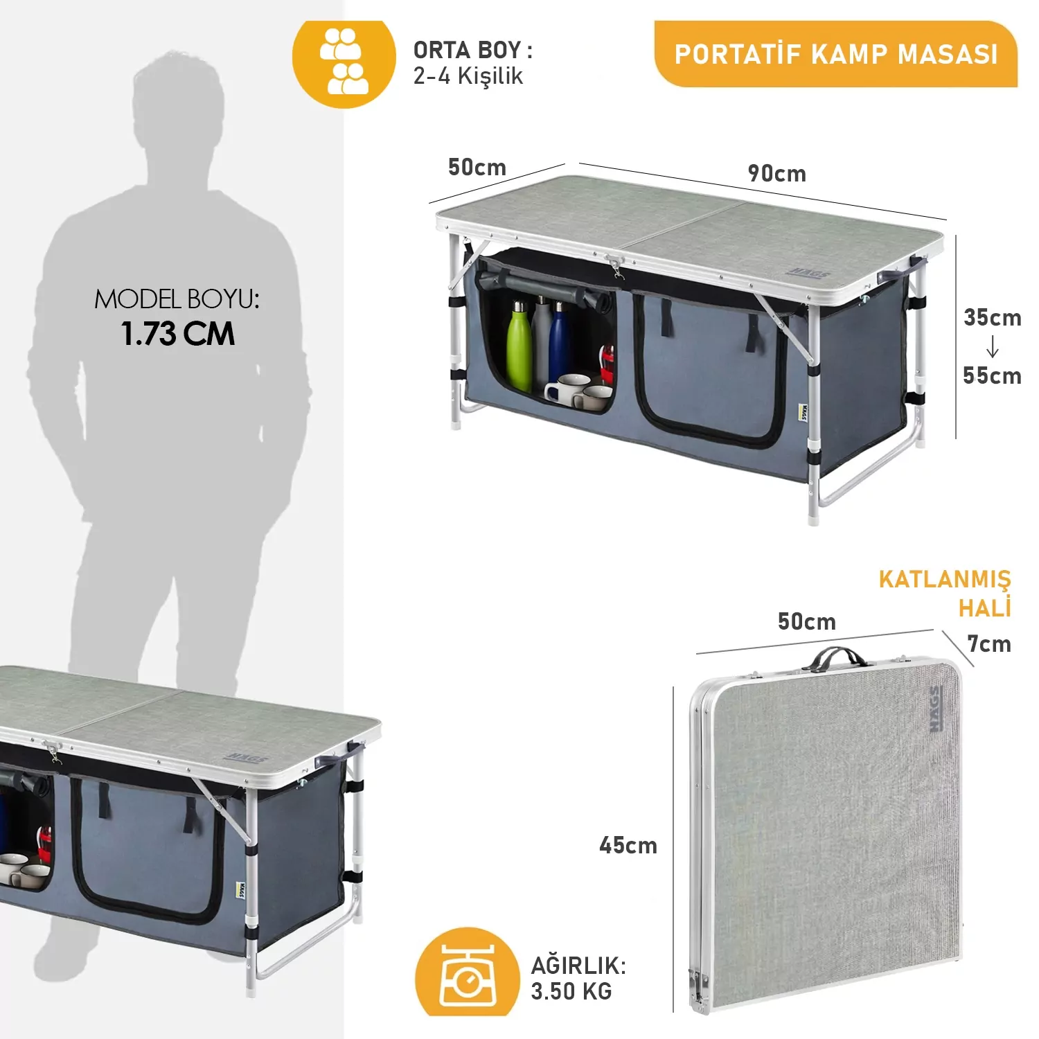 ✅ BÜYÜK KAPASİTELİ DEPOLAMA BÖLMELİ KAMP MASASI: Bu katlanır haegs kamp masasında her türlü yiyecek, içecek veya çatal bıçak takımı için büyük boy bir saklama dolabı bulunur. Depolama organizer bölmesini 8 adet cırt cırt ve 6 adet kancayla kolayca sabitleyebilirsiniz. Fermuar tasarımı eşyaların düşmesini önler. Kamp Mutfağı saklama bölmesin kumaşı su geçirmezdir, İki parça ahşap altlık sağlamlığı artırır, Çıkarılabilir bölmesi kolay saklama ve rahat taşınabilirlik sağlar.