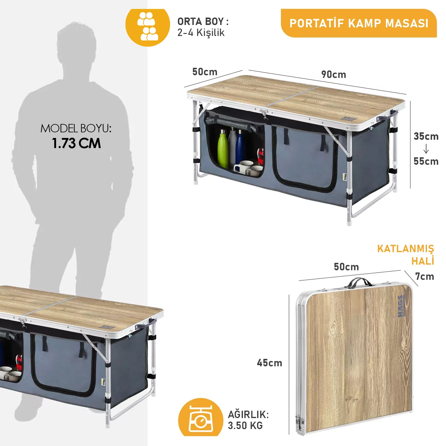 ✅ BÜYÜK KAPASİTELİ DEPOLAMA BÖLMELİ KAMP MASASI: Bu katlanır haegs kamp masasında her türlü yiyecek, içecek veya çatal bıçak takımı için büyük boy bir saklama dolabı bulunur. Depolama organizer bölmesini 8 adet cırt cırt ve 6 adet kancayla kolayca sabitleyebilirsiniz. Fermuar tasarımı eşyaların düşmesini önler. Kamp Mutfağı saklama bölmesin kumaşı su geçirmezdir, İki parça ahşap altlık sağlamlığı artırır, Çıkarılabilir bölmesi kolay saklama ve rahat taşınabilirlik sağlar.