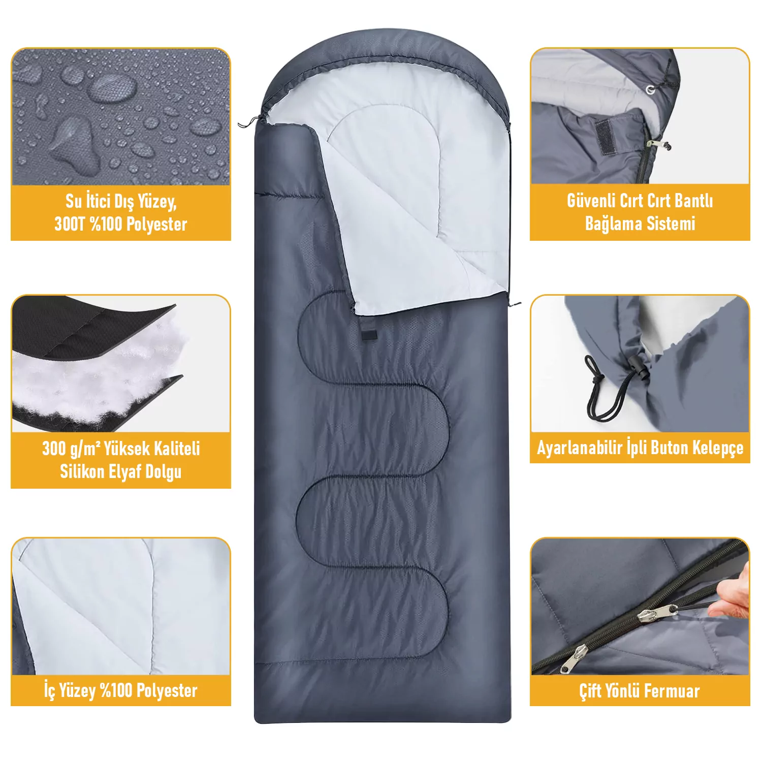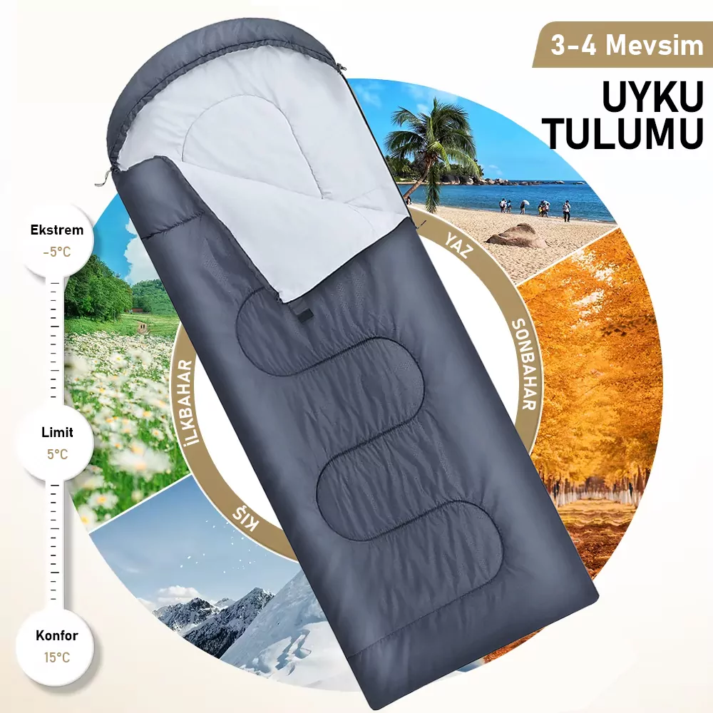 ✅ KONFORLU VE SICAK UYKU TULUMU: Kamp uyku tulumunun dış kumaşı su itici özellikli %100 polyester kumaştan oluşur, iç yüzey kumaşı %100 polyester kumaştır ve 300 g/m²'lik yüksek kaliteli silikon elyaf dolgu sıcaklık ve uzun ömür sağlar. Kış uyku tulumunun sıcaklık aralığı: Konfor: 15°C / Limit: 5°C / Ekstrem: -5°C ve farklı sıcaklıklar dikkate alınarak farklı mevsimlerde ve farklı sıcaklıklarda sıcak bir uykunun tadını çıkarabilirsiniz.