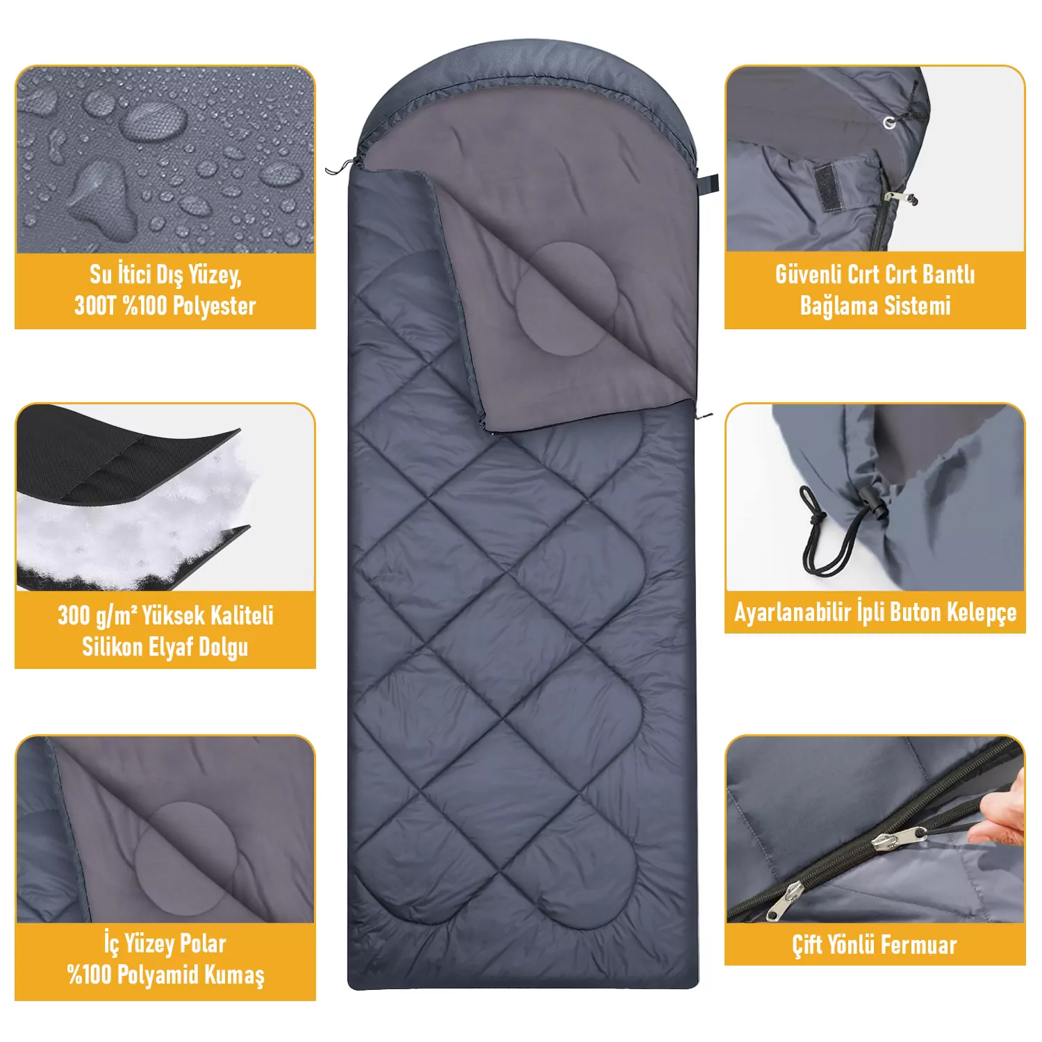 ✅ KONFORLU VE SICAK UYKU TULUMU: Kamp uyku tulumunun dış kumaşı su itici özellikli %100 polyesterden oluşur, iç astar %100 Polyamid Polar kumaştır ve 300 g/m²'lik yüksek kaliteli silikon elyaf dolgu sıcaklık ve uzun ömür sağlar. Kış uyku tulumunun sıcaklık aralığı: Konfor: 10°C / Limit: 0°C / Ekstrem: -10°C ve farklı sıcaklıklar dikkate alınarak farklı mevsimlerde ve farklı sıcaklıklarda sıcak bir uykunun tadını çıkarabilirsiniz.